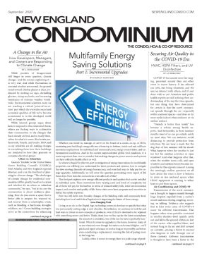 Multifamily Energy Saving Solutions Part 1: Incremental Upgrades BY DARCEY GERSTEIN September 2020 NEWENGLANDCONDO.COM the minute it is available, even if the one we have is perfectly func- tional. When it comes to upgrades in the home, however, many of us are reluctant, even though the stakes can be much higher—we’ll patch and repair a furnace or roof as long as we possibly can before even considering a replacement, running the risk of paying more in the long run. Luckily, when it comes to energy, there is a wide range of prod- 205 Lexington Avenue, NY, NY 10016 • CHANGE SERVICE REQUESTED continued on page 8 THE CONDO, HOA & CO-OP RESOURCE CONDOMINIUM NEW ENGLAND While pockets of disagreement still linger in some quarters, climate change—and the science explaining it— is very real. And while fluctuations in seasonal weather are normal, the general trend toward a hotter planet is clear, evi- denced by melting ice caps, dwindling glaciers, rising sea levels, and increasing incidences of extreme weather world- wide. Environmental scientists warn we are reaching a critical ‘point-of-no-re- turn’ past which the everyday social and economic qualities of life we’ve become accustomed to in the developed world will no longer be possible. While interest groups argue about how to respond to this existential threat, others are finding ways to acclimatize their communities to the changes that have already arrived, and to ready them- selves for what’s to come. Real estate pro- fessionals, boards, and condo, HOA and co-op residents are all making changes in everything from how their buildings are insulated to how they generate or consume electrical power. Urban vs. Suburban Gautam Tarafdar is the United States Green Building Council’s (USGBC’s) Mid-Atlantic and New England regional director, and is at the forefront of plan- ning for climate change. “The challenges of climate change for residential com- munities differ greatly based on location and whether it’s an urban or suburban community,” he says, “but at its core the conversation is about resilience plan- ning. How do you create a space that is better able to prepare for, respond to, and recover from a catastrophic event, such as flooding, a hurricane, drought, wildfires, etc.? Green building strategies serve as the cornerstone for enhancing Whether you reside in, manage, or serve on the board of a condo, co-op, or HOA, examining your building’s energy efficiency from top to bottom, inside and out, will have enormous implications for individual and communal costs, energy conservation, and en- vironmental conditions. And in the current unprecedented global viral pandemic, it is more important than ever to consider that making changes to power sources and systems can have collective health effects as well. So where to begin? In this two-part investigation of energy innovations for multifamily properties, we will help you understand the latest products and systems, how to navigate the slow-moving channels of energy bureaucracy, and even find ways to help pay for en- ergy upgrades. Additionally, we will cover the question permeating every aspect of life these days: How does the coronavirus crisis affect all of this? This first part explores new energy-efficient products and updates that can be installed in individual units. These innovations have varying costs and levels of complexity, but all of them will pay for themselves in terms of reduced utility bills, lower environmental impact, and comfort and quality of life. Some states even have programs and incentives to defray the uptake expenses. Part two will delve into broader changes at the building-wide and community level, including how local and federal legislation is impacting the future of clean energy. Low-Hanging Fruit Living as we do in the Digital Age, technology seems to develop so quickly that what was just recently cutting-edge is now obsolete. Nevertheless, we continue to look for and find ways to invest in new concepts or products, even if they’re destined to be replaced with something newer and better. Think about how we line up for the latest smartphone COVID-19 has caused more far-rang- ing, persistent anxiety than any other event in recent history. It has affected our jobs, our living situations, and the way we interact with others, and it’s not done with us yet. Scientists and public health experts are still refining their un- derstanding of the way the virus spreads, but one thing they have determined for certain is that the novel coronavi- rus spreads through the air—especially within enclosed spaces—and does so far more easily indoors than outdoors or via surface contact. “Outside is better than inside” has become a refrain among health ex- perts. And fortunately, in these summer months most of us can go outside safely on most days. We can maintain social distancing to provide protection from infection. We can wear a mask. But the dog days of late summer still lie ahead. What happens when the weather is just too hot for outdoor activities or open windows? And what happens after that, when the weather turns cold, and open windows and outdoor forays become im- possible for the opposite reason? Among the seemingly endless questions we all have about the virus is how it behaves in more or less enclosed spaces when HVAC equipment is running to either heat or cool those spaces. Air Conditioning and COVID-19 Transmission of the novel coronavi- rus is thought to happen mainly through large droplets expelled from a carrier’s mouth and nose during coughing, sneez- ing, or talking. Evidence also suggests that at least some cases of COVID-19 occur via airborne transmission. That happens when virus particles contained in smaller droplets don’t quickly settle out and fall to the ground within six feet of the carrier who expelled them, and instead hang in the air and drift around on currents—posing a threat to anyone who happens to walk throug