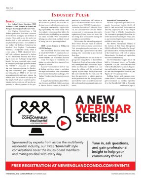 4 NEW ENGLAND CONDOMINIUM -SEPTEMBER 2020 NEWENGLANDCONDO.COM Industry Pulse Events New England Condo Introduces FREE Webinars—a New Resource for Boards and Managers at newenglandcondo.com/events New England Condominium , a Yale Robbins publication, has been a resource for the boards, managers, and residents of condos, HOAs, and co-ops for nearly two decades, both in print and online—and we are pleased to announce a new addition to our toolkit. Yale Robbins Productions has launched New England Condominium Webinars, a Cooperator Event, which is a new series of FREE educational ‘town- hall’ style webinars, sponsored by leaders in the multifamily industry and focus- ing on issues and challenges facing today’s boards. We have assembled expert panels on everything from legal questions around the COVID-19 pandemic to optimiz- ing your insurance coverage to disinfect- ing your community’s pool. Registration and attendance are FREE to all—just visit newenglandcondo.com/events, choose the webinar you’d like to attend, and sign up. It’s that simple. You’ll get an email link and re- minders for the event, and will have the op- portunity to submit questions for the pan- elists before and during the webinar itself. Past events are archived and available on- demand on newenglandcondo.com/events. Serving on your board is a big job, and a big responsibility, but sound, timely advice from industry veterans can help lighten the load and make your building or association run more smoothly. We’re committed to helping you achieve that, and look forward to ‘seeing’ you at an upcoming webinar! MEEB Lawyers Featured in Webinar on COVID Challenges Have you fretted about the many ways in which the COVID-19 pandemic has af- fected your community? Capital projects, vendor relations, use of amenities, elections — nearly every aspect of community asso- ciation operations has been impacted over the past six months. If you’ve wondered about the best ways of dealing with these issues — and about the steps (and missteps other communities have taken) in facing these challenges, New England Condominium has a great resource for you! In August, Richard Brooks, Janet Oulou- sian Aronson, and Mark Einhorn, partners at Marcus, Errico, Emmer & Brooks PC., presented a ‘virtual town hall’ webinar as part of Yale Robbins Publications’ FREE ed- ucational series. “COVID Complications – Unraveling the Pandemic’s Financial, Physi- cal, and Administrative Crisis for HOAs” encompassed a wide-ranging, informative exploration of those issues, and more, that are facing HOA communities during this complicated, stressful time. Did you miss this outstanding program? Don’t worry! You can watch an archived video of the webinar at your convenience. Visit newenglandcondo.com/events to see what these legal experts have to say about keeping your community on an even keel these days. This legal webinar is just one in the on- going series being offered by Yale Robbins Productions. To attend upcoming webinars, visit newenglandcondo.com/events. Regis- tration and attendance are FREE to all—just choose the webinar you’d like to attend, and sign up. It’s that simple. You’ll get an email link and reminders for the event, and will have the opportunity to submit questions for the panelists before and during the webi- nar itself. Past events are archived and avail- able on demand on newenglandcondo.com/ events. Regional Golf Tourneys on Tap The New England Chapter of the Com- munity Associations Institute (CAI) will hold its 28th annual Golf Tournament on Thursday, September 10, at the Walpole Country Club in Walpole, Massachusetts. The tournament, postponed from June, in- cludes lunch, tournament give-aways, priz- es, and trophies. Registration information is available at www.caine.org. The Boston Metropolitan Chapter of the Institute of Real Estate Management (IREM) will hold its “Home for Our Troops” golf tournament on Monday, September 14, at the Granite Links Golf Club in Quincy, Massachusetts. For details and registration, visit www.iremboston.org. The New Hampshire Chapter of CAI will hold its 21st annual tourney on Thursday, September 24, at the Lyman Orchards Golf Club in Middlefield, Connecticut. Registra- tion and breakfast are at 8 am, shotgun start at 9, and lunch banquet with awards at 2 pm. Register at www.caict.org/events. Building Owners and Managers Asso- ciation (BOMA) Boston will hold its annual golf tournament on Monday, September 28 at the Pinehills Golf Club in Plymouth, PULSE A NEW WEBINAR SERIES! Tune in, ask questions, and gain professional insight to help your community thrive! Sponsored by experts from across the multifamily residential industry, our FREE ‘town hall’ style conversations cover the issues board members and managers deal with every day. FREE REGISTRATION AT NEWENGLANDCONDO.COM/EVENTS continued on page 13