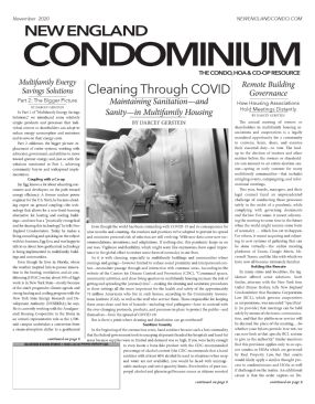 Cleaning Through COVID Maintaining Sanitation—and Sanity—in Multifamily Housing BY DARCEY GERSTEIN November 2020 NEWENGLANDCONDO.COM to even locate a bona fide product with the CDC-recommended percentage of alcohol content (the CDC recommends that a hand sanitizer with at least 60% alcohol be used in situations when soap and water are not available), you would be faced with unimagi- nable markups and strict quantity limits. Even bottles of pure iso- propyl alcohol and glycerin gel became scarce as citizens resorted 205 Lexington Avenue, NY, NY 10016 • CHANGE SERVICE REQUESTED continued on page 6 THE CONDO, HOA & CO-OP RESOURCE CONDOMINIUM NEW ENGLAND In Part 1 of “Multifamily Energy Savings Solutions,” we introduced some relatively simple products and processes that indi- vidual owners or shareholders can adopt to reduce energy consumption and emissions and to save on their energy costs. Part 2 addresses the bigger picture: re- placement of entire systems; working with advocates, government, and utilities to move toward greener energy; and, just as with the solutions mentioned in Part 1, achieving community buy-in and widespread imple- mentation. Coupling with a Co-op Jay Egg knows a lot about educating con- sumers and developers on the path toward energy efficiency. A former nuclear power engineer for the U.S. Navy, he became a lead- ing expert on ground coupling—the tech- nology that allows for a non-fossil-burning alternative for heating and cooling build- ings—and now has a “practically evangelical zeal for sharing this technology,” he tells New England Condominium . Today he makes a living consulting and speaking on the subject with his business, Egg Geo, and was happy to talk to us about how geothermal technology is being implemented in multifamily build- ings and communities. Even though he lives in Florida, where the weather inspired him to pursue innova- tion in the heating, ventilation, and air con- ditioning (HVAC) sector, about 30% of Egg’s work is in New York State—mostly because of the state’s progressive climate agenda and strong heating and cooling program with the New York State Energy Research and De- velopment Authority (NYSERDA), he says. He is currently working with the Amalgam- ated Housing Cooperative in the Bronx in an owner’s representative role as the 1,500- unit campus undertakes a conversion from a steam-absorption chiller to a geothermal Even though the world has been contending with COVID-19 and its consequences for nine months and counting, the routines and practices we’ve adopted to prevent its spread and minimize personal risk of infection are still evolving. With new data come new rec- ommendations, inventions, and adaptations. If nothing else, this pandemic keeps us on our toes. Vigilance and flexibility, which might seem like oxymorons, have equal impor- tance in the global effort to restore some form of normalcy in our lives. So it is with cleaning, especially in multifamily buildings and communities where comings and goings—however limited to reduce social proximity and interpersonal con- tact—necessitate passage through and interaction with common areas. According to the website of the Centers for Disease Control and Prevention (CDC), “Communal spaces, community activities, and close living quarters in multifamily housing increase the risk of getting and spreading the \[corona\]virus”—making the cleaning and sanitation procedures in these settings all the more important for the health and safety of the approximately 74 million Americans who live in such homes, according to the Community Associa- tions Institute (CAI), as well as the staff who service them. Those responsible for keeping these areas clean and free of hazards—including viral pathogens—have to contend with the ever-changing protocols, products, and processes in place to protect the public—and themselves—from the spread of COVID-19. But is there a point where cleaning and disinfection can go overboard? Sanitizer Insanity In the beginning of the coronavirus crisis, hand sanitizer became such a hot commodity that the federal government took to usurping shipments headed for hospitals and hard-hit areas because supplies were so limited and demand was so high. If you were lucky enough The annual meeting of owners or shareholders in multifamily housing as- sociations and cooperatives is a legally mandated opportunity for a community to convene, learn, share, and exercise their essential duty—to vote. The lead- up to the election of trustees and other matters before the owners or sharehold- ers can amount to an entire election sea- son—spring or early summer for many multifamily communities—that includes mingling events, campaigning, and infor- mational meetings. This year, boards, managers, and their legal counsel faced an unprecedented challenge of conducting these processes safely in the midst of a pandemic while complying with governing documents and the law. For some, it meant adjourn- ing the meeting to some time in the future when the world might resume some form of normalcy … which has yet to happen. For others, it meant acquiring and adjust- ing to new systems of gathering that can be done virtually—the online meeting platforms of Zoom, Google Meets, Mi- crosoft Teams, and the like with which we have now all become intimately familiar. Holding the Remote In many states and localities, the leg- islature offered some solutions. Scott Smiler, attorney with the New York firm Gallet Dreyer Berkey, tells New England Condominium that Business Corporation Law (BCL), which governs cooperatives as corporations, was amended “specifical- ly \[to provide\] that meetings can be held solely by means of electronic communica- tion, and that the platform or service will be deemed the place of the meeting….So whether your bylaws provide it or not, we can now look at that specific BCL section to give us the authority.” Smiler mentions that this
