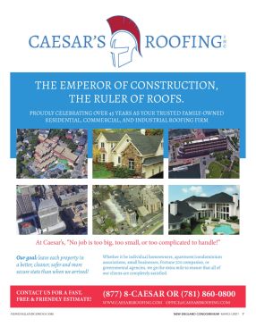 NEWENGLANDCONDO.COM NEW ENGLAND CONDOMINIUM -MARCH 2021 7 THE EMPEROR OF CONSTRUCTION, THE RULER OF ROOFS. PROUDLY CELEBRATING OVER 45 YEARS AS YOUR TRUSTED FAMILY-OWNED RESIDENTIAL, COMMERCIAL, AND INDUSTRIAL ROOFING FIRM At Caesar’s, “No job is too big, too small, or too complicated to handle!” CONTACT US FOR A FAST, FREE & FRIENDLY ESTIMATE! Our goal: leave each property in a better, cleaner, safer and more secure state than when we arrived! Whether it be individual homeowners, apartment/condominium associations, small businesses, Fortune 500 companies, or governmental agencies, we go the extra mile to ensure that all of our clients are completely satisfi ed. (877) 8-CAESAR OR (781) 860-0800 WWW.CAESARSROOFING.COM OFFICE@CAESARSROOFING.COM