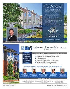 NEWENGLANDCONDO.COM NEW ENGLAND CONDOMINIUM -AUGUST 2021 9 ■ Depth of Knowledge & Experience ■ Expert Advice ■ Creative Approaches & Solutions ■ Flexible Billing Arrangements (781) 817-4900 O NE A DAMS P LACE , 859 W ILLARD S TREET , S UITE 440 Q UINCY , MA 02169 www.lawmtm.com MTM is a full-service Condominium & Real Estate Law Firm Experience, Integrity, & Drive Set Us Apart Uncommon Expertise for your Community of Common Interests Thomas Bhisitkul (617) 934-4603 tbhisitkul@lawmtm.com Kimberly A. Bielan (781) 817-4607 kbielan@lawmtm.com Christopher S. Malloy (617) 934-4604 cmalloy@lawmtm.com Douglas A. Troyer (781) 817-4605 dtroyer@lawmtm.com Thomas O. Moriarty (781) 817-4603 tmoriarty@lawmtm.com (617) 934-4550 265 F RANKLIN S TREET , S UITE 1801 B OSTON , MA 02110 (508) 459-8516 39 T OWN H ALL S QUARE F ALMOUTH , MA 02540 A Property Management Company You Can Trust At J. Butler Property Management, LLC., we measure our success in terms of client satisfaction and take a long-term view of every relationship. www.jbutlerpropertymgmt.com 978.694.9004 James R. Butler IV Executive Manager • Family owned and managed Massachusetts based property management company • Blends management expertise with open communication between the board, unit owners and managing agent, making for a healthier property • Superior cost cutting strategies and vendor pricing • Community website, work order system, online payments • An in-house maintenance team that is able to reduce costs and offer an unparalleled level of service