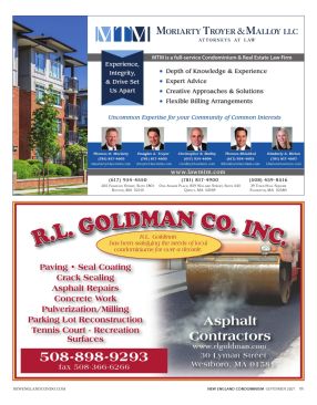 NEWENGLANDCONDO.COM NEW ENGLAND CONDOMINIUM -SEPTEMBER 2021 11 ■ Depth of Knowledge & Experience ■ Expert Advice ■ Creative Approaches & Solutions ■ Flexible Billing Arrangements (781) 817-4900 O NE A DAMS P LACE , 859 W ILLARD S TREET , S UITE 440 Q UINCY , MA 02169 www.lawmtm.com MTM is a full-service Condominium & Real Estate Law Firm Experience, Integrity, & Drive Set Us Apart Uncommon Expertise for your Community of Common Interests Thomas Bhisitkul (617) 934-4603 tbhisitkul@lawmtm.com Kimberly A. Bielan (781) 817-4607 kbielan@lawmtm.com Christopher S. Malloy (617) 934-4604 cmalloy@lawmtm.com Douglas A. Troyer (781) 817-4605 dtroyer@lawmtm.com Thomas O. Moriarty (781) 817-4603 tmoriarty@lawmtm.com (617) 934-4550 265 F RANKLIN S TREET , S UITE 1801 B OSTON , MA 02110 (508) 459-8516 39 T OWN H ALL S QUARE F ALMOUTH , MA 02540