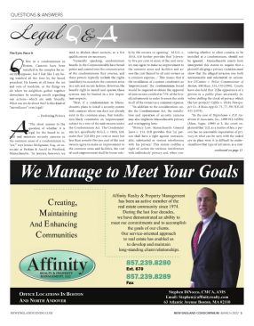 NEWENGLANDCONDO.COM NEW ENGLAND CONDOMINIUM -MARCH 2022 5 QUESTIONS & ANSWERS Legal Q A& O FFICE OCATIONS N L I B OSTON A ND N ORTH A NDOVER The Eyes Have It Q I live in a condominium in Boston. Cameras have been installed in the complex for se- curity purposes, but I feel like I am be- ing watched all the time by the board president. He knows at all times the ins and outs of residents, or the things we do when we neighbors gather together downstairs by sending emails regarding our actions—which are only friendly. What can we do about this? Is this kind of “surveillance” even legal? — Preferring Privacy A “The short answer to the question of whether it is legal for the board to in- stall and maintain security cameras in the common areas of a condominium is, ‘yes,’” says Jessica Molignano, Esq., an as- sociate at Perkins & Anctil in Westford, Massachusetts. “As lawyers, however, we tend to disdain short answers, so a few ly by the owners so agreeing.’ M.G.L. c. sidering whether to allow cameras to be qualifications are necessary. “Generally speaking, condominium ty-five per cent or more of the unit own- boards in the Commonwealth have broad ers may agree to make an improvement to interpreted this statute to require that a power and control over the common areas the common areas and facilities and as- of the condominiums they oversee, and sess the cost thereof to all unit owners as show that the alleged invasion was both these powers typically include the rights a common expense…’ This means that if unreasonable and substantial or serious. (and duty) to maintain the common areas the installation of a system constitutes an See in a safe and secure fashion. However, the ‘improvement,’ the condominium board board’s right to install and operate these would be required to obtain the approval have also held that ‘\[t\]he appearance of a systems may be limited in a few impor- tant respects. “First, if a condominium in Massa- chusetts plans to install a security system with cameras where one does not already der the Condominium Act, the installa- exist in the common areas, that installa- tion likely constitutes an ‘improvement’ may also implicate Massachusetts privacy subject to a vote of the unit owners under and wiretapping laws: the Condominium Act. The Condomini- um Act, specifically M.G.L. c. 183A, §18, Laws c. 214, §1B provides that ‘\[a\] per- states that ‘\[i\]f fifty per cent or more but son shall have a right against unreason- less than seventy-five per cent of the unit able, substantial or serious interference eye in plain view, it is difficult to under- owners agree to make an improvement to with his privacy.’ This statute codifies a stand how that type of intrusion, as a mat- the common areas and facilities, the cost right of action for tortious interference of such improvement shall be borne sole- 183A, §18 further provides that ‘\[s\]even- of unit owners entitled to 75% of the ben- eficial interests in order to assess the costs volves doffing the cloak of privacy which to all of the owners as a common expense. the law protects’ “In addition to the considerations un- tion and operation of security cameras “Privacy Law: Massachusetts General plained that ‘\[i\]f, as a matter of law, a per- with individuals’ privacy and, when con- installed at a condominium, should not be ignored. Massachusetts courts have plaintiff alleging a privacy violation must O’Connor v. Police Commissioner of Boston , 408 Mass. 324, 330 (1990). Courts person in a public place necessarily in- Cefalu v. Globe Newspa- per Co ., 8 Mass.App.Ct. 71, 77, 391 N.E.2d 935 (1979). “In the case of Digirolamo v. D.P. An- derson & Associates, Inc. , 1999 WL 345592 (Mass. Super. 1999) at 3, the court ex- son has no reasonable expectation of pri- vacy in what can be seen with the naked continued on page 13