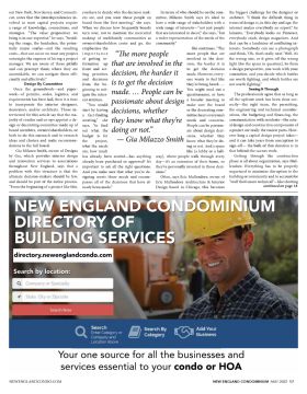 NEWENGLANDCONDO.COM NEW ENGLAND CONDOMINIUM -MAY 2022 17 out New York, New Jersey, and Connecti- cut, notes that the interdependencies in- volved in most capital projects require board from the first meeting,” she says. have a wide range of stakeholders with a terms of design is, in this day and age, the a range of knowledge, connections, and When we discuss how frequently boards wide range of interests—“not just people internet makes everybody an expert,” he strategies. “The value proposition we turn over, not to mention the mercurial that are interested in decor,” she says, “but laments. “Everybody looks on Pinterest, bring is in our expertise,” he says. “Avoid- ing the snags, the headaches, the poten- tially major snafus—and the resulting emphasizes the costs—that can occur on most any project im p o r t a n ce outweighs the expense of hiring a project of getting in- manager. We are aware of those pitfalls formation up and can preempt them; where they are front and set- unavoidable, we can navigate them effi- ciently and effectively.” Design By Committee Once the groundwork—and paper- work—of permits, codes, logistics, and igate the inher- requirements has been laid, then it is time ent attrition. to incorporate the interior designers, decorators, and/or architects. Those in- terviewed for this article say that the ma- jority of condos and co-ops appoint a de- sign or decorating committee made up of says, “to find board members, owners/shareholders, or out what the both to do this outreach and to research budget is for ideas and choices and make recommen- dations to the full board. Gia Milazzo Smith, owner of Designs are, how much by Gia, which provides interior design has already been started—has anything way\\\], where people walk through every and renovation services to associations already been purchased or approved? It’s day—it’s an extension of their home, so phase is all about organization, says Mul- throughout New England, says that a important to ask all the right questions. they’re personally invested in those deci- problem with this structure is that the And you make sure that what you’re de- ultimate decision-makers should be few, signing meets those needs and encom- and should be part of the entire process. passes all of the decisions that have al- “From the beginning of a project like this, ready been made.” you have to decide who the decision mak- ers are, and you want those people on mittee, Milazzo Smith says it’s ideal to architect. “I think the difficult thing in makeup of multifamily communities as a wider representation of the needs of the everybody reads design magazines. And owners/shareholders come and go, she community.” ting priorities and decisions from the be- ginning to mit- “You would start by having a fact-finding meeting,” she the project, what the needs In terms of who should be on the com- She continues, “The terests. Somebody can see a photograph more people that are and think, ‘Oh, that’s really neat.’ Well, it’s involved in the deci- sion, the harder it is light \\\[for the space in question\\\]. So from to get the decision a design perspective, you work with your made. However, every- one wants to feel like are worth fighting, and which battles are they’re being heard. … not worth fighting.” You might send out a questionnaire, or have a broader meeting to all the upfront work has been done cor- make sure the board rectly—the right team, the permitting, or the decorating com- mittee hears everyone’s ations, the budgeting and financing, the needs and concerns. communication with residents—the actu- People can be passion- ate about design deci- sions, whether they ever long a capital design project takes— know what they’re do- ing or not. And a space sign-off— the bulk of that duration is in like \\\[a lobby or a hall- sions.” Often, says Eric Mullendore, owner of building or community and to account for Eric Mullendore Architecture & Interior “stuff that’s more technical”—like shutting Design based in Chicago, this becomes the biggest challenge for the designer or that can be a landmine of conflicting in- the wrong size, or it gives off the wrong committee, and you decide which battles Seeing It Through The professionals agree that as long as the engineering and technical consider- al design and construction components of a project are really the easiest parts. How- and it can take years from conception to that behind-the-scenes work. Getting through the construction lendore. Everything has to be properly sequenced to minimize disruption to the directory.newenglandcondo.com Your one source for all the businesses and services essential to your condo or HOA NEW ENGLAND CONDOMINIUM DIRECTORY OF BUILDING SERVICES Search by location: “The more people that are involved in the decision, the harder it is to get the decision made. … People can be passionate about design decisions, whether they know what they’re doing or not.” — Gia Milazzo Smith continued on page 18