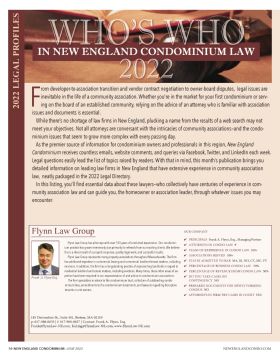 10 NEW ENGLAND CONDOMINIUM -JUNE 2022 NEWENGLANDCONDO.COM 2022 LEGAL PROFIL F rom developer-to-association transition and vendor contract negotiation to owner-board disputes, legal issues are inevitable in the life of a community association. Whether you’re in the market for your first condominium or serv- ing on the board of an established community, relying on the advice of an attorney who is familiar with association issues and documents is essential. While there’s no shortage of law firms in New England, plucking a name from the results of a web search may not meet your objectives. Not all attorneys are conversant with the intricacies of community associations—and the condo- minium issues that seem to grow more complex with every passing day. As the premier source of information for condominium owners and professionals in this region, New England Condominium receives countless emails, website comments, and queries via Facebook, Twitter, and LinkedIn each week. Legal questions easily lead the list of topics raised by readers. With that in mind, this month’s publication brings you detailed information on leading law firms in New England that have extensive experience in community association law, neatly packaged in the 2022 Legal Directory. In this listing, you’ll find essential data about these lawyers—who collectively have centuries of experience in com- munity association law and can guide you, the homeowner or association leader, through whatever issues you may encounter. Flynn Law Group has attorneys with over 100 years of combined experience. Our condomin- ium practice has grown immensely due primarily to referrals from our existing clients. We believe this is a direct result of our quick response, quality legal work, and successful results. Flynn Law Group represents many property associations throughout Massachusetts. The firm has additional expertise in commercial leasing and commercial landlord-tenant matters, including evictions. In addition, the firm has a longstanding practice of representing landlords in regard to residential landlord and tenant matters, including evictions. Many times, these other areas of ex- pertise have been required in our representation of and advice to condominium associations. The firm specializes in advice to the condominium trust, collection of outstanding condo- minium fees, amendments to the condominium documents, and lawsuits regarding disruptive tenants or unit owners. OUR COMPANY 4 PRINCIPALS Frank A. Flynn, Esq., Managing Partner 4 ATTORNEYS IN CONDO LAW 9 4 YEARS OF EXPERIENCE IN CONDO LAW 100+ 4 ASSOCIATIONS SERVED 100+ 4 STATES ADMITTED TO BAR MA, RI, NH, CT, ME, VT 4 PERCENTAGE OF BUSINESS CONDO LAW 50% 4 PERCENTAGE OF REVENUE FROM CONDO LAW 50% 4 DO YOU TAKE CASES ON CONTINGENCY NO 4 PREPARED DOCUMENTS FOR NEWLY FORMING CONDOS NO 4 ATTORNEYS IN FIRM TRY CASES IN COURT YES 185 Devonshire St., Suite 401, Boston, MA 02110 p: 617-988-0633 | f: 617-988-0637 | Contact: Frank A. Flynn, Esq. Frank@FlynnLaw-NE.com, KaLing@FlynnLaw-NE.com, www.FlynnLaw-NE.com Flynn Law Group Frank A. Flynn Esq.