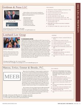 NEWENGLANDCONDO.COM NEW ENGLAND CONDOMINIUM -JUNE 2022 11 Goldman & Pease is a full service law firm specializing in litigation, condominium law, and real estate, providing expert legal advice and representation in: • Real Estate Litigation • Rules Enforcement • Condominium Collections • Landlord Tenant Conflict • Condominium Formation • Developer Transition Issues • Condo Document Amendments OUR COMPANY 4 PRINCIPALS Howard S. Goldman and Cameron C. Pease 4 ATTORNEYS IN CONDO LAW 5 4 YEARS OF EXPERIENCE IN CONDO LAW 35+ 4 ASSOCIATIONS SERVED 150+ 4 STATES ADMITTED TO BAR MA, RI 4 PERCENTAGE OF BUSINESS CONDO LAW 50% 4 PERCENTAGE OF REVENUE FROM CONDO LAW N/A 4 DO YOU TAKE CASES ON CONTINGENCY YES 4 PREPARED DOCUMENTS FOR NEWLY FORMING CONDOS YES 4 ATTORNEYS IN FIRM TRY CASES IN COURT YES Goldman & Pease LLC Howard Goldman, Esq. Cameron Pease, Esq. 160 Gould Street, Suite 320, Needham, MA 02494 hgoldman@goldmanpease.com | p: 781-239-8909 | www.goldmanpease.com 2022 LEGAL PROFILES OUR COMPANY 4 PRINCIPALS Richard Brooks, Janet Aronson, Edmund Allcock, Mark Einhorn, Gary Daddario, Jennifer Barnett, Matthew Gaines, Dean Lennon, John Shaffer, William Thompson and Thomas Aylesworth 4 ATTORNEYS IN CONDO LAW 24 4 YEARS OF EXPERIENCE IN CONDO LAW 28 4 ASSOCIATIONS SERVED OVER 5,000 4 STATES ADMITTED TO BAR MA, RI, NH, ME 4 PERCENTAGE OF BUSINESS CONDO LAW 90% 4 PERCENTAGE OF REVENUE FROM CONDO LAW 90% 4 DO YOU TAKE CASES ON CONTINGENCY NO 4 PREPARED DOCUMENTS FOR NEWLY FORMING CONDOS YES 4 ATTORNEYS IN FIRM TRY CASES IN COURT YES MA Office: 45 Braintree Hill Office Park #107, Braintree, MA 02184 NH Office: 32 Daniel Webster Highway #12, Merrimack, NH 03054 T: 781-843-5000 | www.meeb.com | E-mail: law@meeb.com Marcus, Errico, Emmer & Brooks, P.C. Marcus, Errico, Emmer & Brooks, P.C., focuses its practice on condominium law. Since 1993 our experienced attorneys have provided the full spectrum of legal services to condominium and homeowner associations in Massachu- setts, Rhode Island, New Hampshire and Maine. Representing over 5,000 condominium and homeowner associations, MEEB is one of the largest law firms in the country dedicated to serving the needs of community associations. The partners of the firm have concentrated in this area of law for over 28 years and are among the leaders in the industry, both in New England and on the national level. Four of our attorneys, Henry A. Goodman, V. Douglas Errico, Ed Allcock and Ellen Shapiro, have been admitted to the prestigious Community Associations Institute’s national College of Community Association Lawyers. The firm maintains a full-service litigation department offering both plaintiff and defense counsel services. Additionally, our firm handles complex com- mercial real estate conveyancing and financing, zoning, permitting and other land use matters. We also represent community associations with housing discrimination issues and employment related matters. Lombardi Law Group OUR FIRM 4 PRINCIPALS Frank A. Lombardi & Mary-Joy Howes 4 ATTORNEYS IN CONDO LAW ALL 4 YEARS OF EXPERIENCE IN CONDO LAW 40 4 ASSOCIATIONS SERVED 200+ 4 STATES ADMITTED TO BAR RI & MA 4 PERCENTAGE OF BUSINESS CONDO LAW 90% 4 DO YOU TAKE CASES ON CONTINGENCY YES 4 PREPARED DOCUMENTS FOR NEWLY FORMING CONDOS YES 4 ATTORNEYS IN FIRM TRY CASES IN COURT YES RI CONDOMINIUM LAWYERS In April of 2020, Frank A. Lombardi and Mary-Joy (“MJ”) Howes formed Lom- bardi Law Group, a boutique law firm that focuses on condominium law involv- ing condominium associations, their boards, unit owners, property managers, developers, association lenders and other vendors. Both born and raised in Rhode Island, Frank and MJ have their fingers on the pulse of the most critical issues involving Rhode Island condominiums. They have combined over 50 years of experience in this unique area of the law and currently consult on approximately 200 association-related cases throughout Rhode Island. Issues include document interpretation, drafting and revision, assessment collection, contract review and board and unit owner dispute resolution. Frank and MJ have helped countless clients navigate the nuances of community association law and resolve a variety of complex issues that arise in the residential, multi- family setting where, as Frank says, “although we humans are social beings, we were never really meant to live together.” 14 Breakneck Hill Road, Ste. 203, Lincoln, RI 02965 T: 401-726-1010 | frank@llgri.com | mj@llgri.com | www.lombardilawgroup.com Front Row: Frank A. Lombardi, Esq. and Mary-Joy A. Howes, Esq. Back Row: Based in Lincoln, the “team” also consists of paralegal Pebbles Cortes and legal assistants Beverly Brown and Renee DeBarros, who is also the firm’s office manager. p: 781-292-1080