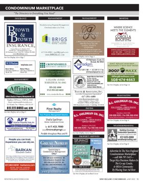 NEWENGLANDCONDO.COM NEW ENGLAND CONDOMINIUM -JUNE 2022 15 Advertise In Th e New England Condominium Marketplace —call 508-797-5415— Target Key Decision Makers In Th e Co-op, Condo, & HOA Community By Placing Your Ad Here See Our Display Ad on Page 8 See Our Display Ad on Page 7 See Our Display Ad on Page 3 CONDOMINIUM MARKETPLACE “ e Directory to Everything You Need” 617.482.5500 barkanco.com | BOSTON NEW YORK HARTFORD PROVIDENCE WASHINGTON, DC People you can trust. Experience you can rely on. Serving condominium and homeowner associations throughout New England. Everything from suburban townhomes to ultra-luxury residential towers. Brown & Brown Insurance Contact Thomas G. Shields, CLCS 978-408-1231 | tshields@bbdedham.com 980 Washington Street | Suite 325 | Dedham, MA 02026 www.bbdedham.com G REAT N ORTH PROPERTY MANAGEMENT Specializing in Condominium Management ONLY Contact: Lou Gargiulo , CMCA • Justin Gargiulo , CPM www.g r ea tnor th.net www.g r ea tnor th.net G REAT N ORTH 508-594-6100 NORWOOD, MA 978-278-4000 PEABODY, MA 603-436-4100 EXETER, NH 603-891-1800 MERRIMACK, NH T hayer & a ssociaTes , i nc . Accredited Management Organization ® 617-354-6480 www.thayerassociates.com Contact: Douglas G. Thayer, CPM , ® Kenneth S. O’Brien, Dwight Johnson 1812 Massachusetts Avenue • Cambridge, MA 02140 Westboro, MA 01581 508-898-9293 • Fax 508-366-6266 Contact: Richard Goldman • www.rlgoldman.com MANAGEMENT 617.349.1100 • 617.349.1111 fax info@paradigmpartner.com 470 Washington St,Suite 25 Norwood, MA 02062 J. Butler Property Management, LLC. 2500 Main Street, Suite 105 Tewksbury, MA 01876 978-694-9004 http://www.jbutlerpropertymgmt.com Contact: James R. Butler IV, CMCA, AMS James@jbutlerpropertymgmt.com JButler Property_2_5_CSD:Layout 1 3/28/12 Robert Marcus Real Estate 345 Boylston Street Newton, MA 02459 Phone: 617-277-1116 Email: Robert@RMRE.com www.rmre.com Contact: Robert Marcus Robert Marcus Real Estate_1CSD_NEC_May2012: 42 Glen Avenue 9 ATLANTIC AVENUE MARBLEHEAD, MA 01945 978-532-4800 FAX 978-532-6023 “Responsive, trained professionals ready to serve your community” www.crowninshield.com Your Property Management Solution. Frank Cevetello Chief Operating Officer Tel: 617.423.7000 www. firstrealtymgt .com Portfolio throughout Mass and RI Sheila Spellman Director, Condominium Division Westboro, MA 01581 508-898-9293 • Fax 508-366-6266 Contact: Richard Goldman • www.rlgoldman.com PAVING SEALCOATING Kevin Kehoe kevin.kehoe wtphelan @ .com robert.masse wtphelan 781.641.7230 Robert Masse @ .com 781.641.7220 wtphelan.com ddlevy@roofmaxx.com 5 0 8 -4 4-4 7 66 3 DON’T REPLACE YOUR ROOF… REJUVENATE IT WITH ROOF MAXX! WEATHERPROOFING MANAGEMENT MANAGEMENT See Our Display Ad on Page 14 Stephen DiNocco, CMCA, AMS Email: stephen@affinityrealty.com 63 Atlantic Ave. • Boston, MA 02110 617.227.0893 ext. 670 Affinity Realty & Property Management, LLC Revolutionizing Property Management One Association at a Time. 617.536.4900 | swolf@brigsllc.com WWW .BRIGSLLC. COM ARLINGTON | BEVERLY BOSTON | HOLLISTON INSURANCE www.kellyspropertyservices.com bryan.kelly@kellyspropertyservices.com 888-KELLY-11 Our goal is to make YOU our next reference! CONDO DIVISION ROOFING PAINTING CARPENTRY TOP-QUALITY ONE-STOP SOLUTIONS for your condominium’s: INTERIOR & EXTERIOR MAINTENANCE & REPAIRS 4 4 4 WE MANAGE ALL THE DETAILS! ROOFING See Our Display Ad on Back Cover PROPERTY SERVICES See Our Display Ad on Page 5 See Our Display Ad on Page 9 See Our Display Ad on Page 9 Incorporated in 1989