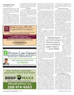 DAL CPA David A. Levy, CPA, P.C. Certified Public Accountants Areas of expertise in Condominiums ■ Cooperatives ■ Timeshares ALL COMMON INTEREST DEVELOPMENTS Call our office for a complimentary review of your financial needs 617-566-3645 or 866-842-0108 20 Freeman Place, Needham, MA 02492 DavidALevy_E4C_NEC_Sept15:Layout 1 10/7/2015 3:54 PM Page 1 SERVICING THE EAST COAST FOR OVER 30 YEARS Member AICPA, CAI-NE www.DALCPAPC.net dlevy@dalcpapc.net ddlevy@roofmaxx.com 5 0 8 -4 4-4 7 66 3 DON’T REPLACE YOUR ROOF… REJUVENATE IT WITH ROOF MAXX! 185 Devonshire Street, Suite 401, Boston, MA 02110 Quality Representation at Reasonable Rates. (617) 988-0633 Contact Attorney Frank Flynn: FRANK@FLYNNLAW-NE.COM Flynn_E4C.qxp:Layout 1 12/8/14 2:30 PM Page 1 12 NEW ENGLAND CONDOMINIUM -JULY 2022 NEWENGLANDCONDO.COM might materially affect the finances of the organization,” and adds that most judg- ments become public record, allowing any- one to find case information if and when it corporation’s or association’s legal counsel reaches that stage. Meanwhile, says Scott Piekarsky, a part- ner in the litigation and real estate depart- ments of the Hackensack, New Jersey office of law firm Phillips Nizer LLP, “Don’t dis- cuss the case with anyone, and don’t ignore an attorney with Stark & Stark in Law- it. Even if a board member is a lawyer, leave renceville, New Jersey. “When you look at it to your \\\\\\\\\\\\\\\[condo, HOA, or co-op’s\\\\\\\\\\\\\\\] counsel. insurance policies—which are contracts— Anything you say can be used against you we learned a long time ago that if there’s the in ensuing litigation. Get professional help. Don’t try to confront the person and try to intimidate them. Go through normal chan- nels. That’s why they exist.” So Sue Me The ‘normal channels,’ according to pros, are to immediately notify both the and its insurance provider. In the case of the latter, coverage may depend on timely and proper notification. “A lawsuit starts even before the com- plaint has been served,” says Chris Florio, potential for a suit, you need to give written or unit owners as a maintenance increase notice to the insurance broker of that po- tential. Policies contain language that state the board chooses to allocate its financial if you don’t give adequate notice for a suit, resources. the carrier may issue a declination of the claim.” Coverage also depends on what type of volved in litigation—not to mention the suit is being brought, and by whom. If a res- ident or contractor is suing the board, for most always preferable to at least attempt to example, the legal defense is normally cov- ered by a Directors & Officers (D&O) pol- icy that the building or community should resolution, or ADR. In ADR, the parties at maintain under its insurance plan. Other odds work with a neutral third to reach a claims against the corporation or associa- tion as a whole—a slip-and-fall, construc- tion defects, and so forth—would likely be ther mediation or arbitration. covered under its general liability policy. Some governing docs contain provisions interchangeably, they’re actually two dif- that indemnify the board for actions taken ferent processes. According to the Ameri- in good faith. This indemnification can be can Arbitration Association (AAA), “Ar- over and above any available D&O liability bitration is the submission of a dispute to insurance. Either way, notification of impending ‘neutrals’) for a final and binding decision, litigation or submission of a claim does known as an ‘award.’ Awards are made in not risk premium escalations, say the ex- perts. What does affect the premium is ing on the parties in the case. Mediation, historic litigation and other risk factors on the other hand, is a process in which an that might be pres- ent in a building or community (e.g., its age, size, location, or amenities such as a pool or a gym). That is, if a co-op, condo, or HOA has been sued a lot—or if a carrier deems lawsuits likely given certain factors— that co-op, condo, or HOA should maintain a more robust often drawn out for longer periods of time policy to protect it adequately, and should and usually result in a win/loss outcome. expect higher premiums. Ultimately, those Mediation typically has a win-win outcome premium costs are borne by the sharehold- ers or unit owners in their monthly carry- ing charges. Some proprietary leases and condo- minium/association bylaws award attor- neys’ fees to the prevailing party called he declaration or bylaws of a condominium upon to defend a lawsuit filed by a tenant- shareholder or unit owner against a board. tration of disputes in which the matter in “Owners are often surprised when they get controversy has either no specific monetary the bill for \\\\\\\\\\\\\\\[the building or community’s\\\\\\\\\\\\\\\] value or a value of $10,000 or less, other legal costs when they threaten to sue,” says than the levying and collection of assess- one manager who prefers to remain anony- mous. “But so many disputes arise from declaration, bylaws, or rules and regula- unawareness of the bylaws in the first place. tions of the condominium association,” per What they should really understand is that the state’s Condominium Act. by suing their building, they’re basically su- ing themselves and their fellow owners.” When there is a damages judgment against the condo, co-op, or HOA, or if the parties choose to settle, the insurer might pay in some circumstances—at least up to limits set in the policy. Of course, this all depends on dotting all the i’s and crossing all the t’s in the first place, and does not ap- ply to acts of fraud, negligence, or decisions made in bad faith. But when there is no coverage, or if the damages exceed policy limits, those costs fall on the shareholders or special assessment, depending on how I Won’t See You in Court Because of the time and expense in- toll it takes 