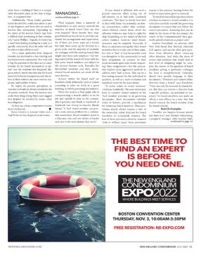 NEWENGLANDCONDO.COM NEW ENGLAND CONDOMINIUM -JULY 2022 13 THE BEST TIME TO FIND AN EXPERT IS BEFORE YOU NEED ONE. BOSTON CONVENTION CENTER THURSDAY, NOV. 3, 10:00AM-3:30PM FREE REGISTRATION: NE-EXPO.COM THE NEW ENGLAND CONDOMINIUM EXPO 2022 WHERE BUILDINGS MEET SERVICES away from a building if there is a compa- rable alternative place to live that is litiga- tion- or judgment-free.” Additionally, “Many lender question- naires do ask if the condo association is part of any litigation, and those who are need to disclose that information. Depending on the status of the lawsuit, buyers may have a difficult time purchasing at that commu- nity,” warns Phillips. “Equally, if a buyer has a hard time finding funding for a unit at a specific community, then the seller will not be able to easily sell their unit.” On a more qualitative level, frequent lawsuits can also lead to a less trusting and less harmonious community. Not only will it beg the question of why there are so many lawsuits (Is the board incompetent or un- fair? Are the residents hot-tempered, liti- gious jerks?), but the fine line that the board must tow between transparency and discre- tion in these matters can cause rumors, sus- picion, and hostility to brew. No matter the process, perception, or outcome, lawsuits are always a headache for all parties involved. Even the lawyers who make their living trying these cases suggest that disputes be resolved by means other than litigation. As they say, a lean compromise is better than a fat lawsuit. n Darcey Gerstein is Associate Editor and a Staff Writer for New England Condominium. What happens when a minority of shareholders or unit owners controls the majority of board votes? How can that even happen? Many boards have stag- gered board service terms to provide con- tinuity for management and supervision. So, if there are seven seats on a board, but only three come up for election in a given cycle, and the majority of residents are unhappy with the existing board, they might elect three new members—but vot- ing control of the board still stays with the four prior board members not subject to the current election cycle. Basically, the dissatisfied residents and their newly- elected board members are stuck till the next election. Actions within the board itself are handled a little differently (and of course according to rules set forth in a given building or HOA’s governing documents). When the issue is a ‘bad apple’ who is compromising a board’s ability to do its job and uphold its duty to the commu- nity it governs, says Frank A. Lombardi of Lombardi Law Group in Lincoln, Rhode Island. “A ‘bad’ board member can pres- ent a real, serious problem for a commu- nity association. Board members stand in a fiduciary role, and owe duties of loyalty and care to the associations they serve.” If your board is afflicted with such a require a ‘due process’ hearing before the person—someone who’s acting out of board or association prior to removal. self-interest, or in bad faith, Lombardi continues, “You have to decide how best you have to remove a board member, it is to deal with them. Occasionally, an hon- est conversation—rather than confron- tation—behind closed doors about the correct procedure. Assuming that you do offensive behavior may help to right the abide by the terms of the documents, the ship. Depending on the nature of the bad courts of this Commonwealth have gen- actor’s conduct, however, more drastic erally upheld removals as proper acts.” measures may be required. Generally, if there is consensus among the other board New York-based firm Herrick, Feinstein members that it is only one of their num- ber who is ‘bad,’ it may be possible (and tions from directors about removing less disruptive to the community) to seek other directors. And while the chain of their resignation. As counsel, we have events and emotions that would lead to made demands upon individuals ‘request- ing’ their resignations—lest the associa- tion explore more aggressive methods to members giving a particular colleague address their ‘bad’ actions. This can be a the boot is straightforward: Generally, face-saving measure for the individual in absent very specific language in their question, as well as a more economic and documents, “Directors can’t remove other expedient route for the association. “If worse comes to worst, however,” “They can only be removed by sharehold- continues Lombardi, “the association may ers. But they can remove a director from have to consider formal removal of the a specific position, say president or sec- ‘bad’ member pursuant to its governing retary.” So board members can make an documents. Most documents—whether officer a non-officer via a vote—but that trusts or bylaws—provide a mechanism doesn’t remove the board member from for removing board members. These pro- visions almost always require a vote of the ownership, rather than just the board members, to accomplish removal. The just don’t jive,” says Michele Schlossberg, best of these provisions allow for removal a property manager with Gumley Haft, ‘with or without cause.’ Some provisions “If you find yourself in a position where critical to carefully consult the governing documents to ensure that you follow the Andrew Freedland, an attorney with LLP, agrees, and says he often gets ques- that level of infighting might be com- plex, the answer to the question of board directors from a board,” says Freedland. the board entirely. Real Life Examples “Conflict can happen because people MANAGING... continued from page 6 continued on page 14
