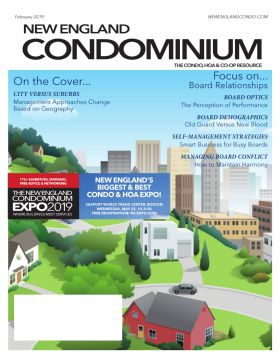 February 2019 NEWENGLANDCONDO.COM THE CONDO, HOA & CO-OP RESOURCE CONDOMINIUM NEW ENGLAND Focus on... Board Relationships BOARD OPTICS The Perception of Performance BOARD DEMOGRAPHICS Old Guard Versus New Blood SELF-MANAGEMENT STRATEGIES Smart Business for Busy Boards MANAGING BOARD CONFLICT How to Maintain Harmony On the Cover... CITY VERSUS SUBURBS Management Approaches Change Based on Geography NEW ENGLAND’S BIGGEST & BEST CONDO & HOA EXPO! SEAPORT WORLD TRADE CENTER, BOSTON WEDNESDAY, MAY 22, 10-3:30 FREE REGISTRATION: NE-EXPO.COM 175+ EXHIBITORS, SEMINARS, FREE ADVICE & NETWORKING THE NEW ENGLAND CONDOMINIUM EXPO 2019 WHERE BUILDINGS MEET SERVICES