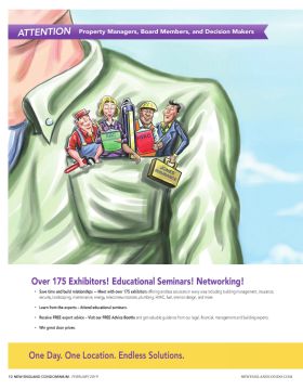12 NEW ENGLAND CONDOMINIUM - FEBRUARY 2019 NEWENGLANDCONDO.COM One Day. One Location. Endless Solutions. • Save time and build relationships – Meet with over 175 exhibitors offering endless solutions in every area including building management, insurance, security, landscaping, maintenance, energy, telecommunications, plumbing, HVAC, fuel, interior design, and more. • Learn from the experts – Attend educational seminars. • Receive FREE expert advice – Visit our FREE Advice Booths and get valuable guidance from our legal, financial, management and building experts. • Win great door prizes. Over 175 Exhibitors! Educational Seminars! Networking! ATTENTION Property Managers, Board Members, and Decision Makers