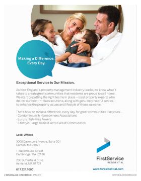 2 NEW ENGLAND CONDOMINIUM - APRIL 2019 NEWENGLANDCONDO.COM Exceptional Service is Our Mission. As New England’s property management industry leader, we know what it takes to create great communities that residents are proud to call home. We start by putting the right teams in place – local property experts who deliver our best-in-class solutions, along with genuinely helpful service, to enhance the property values and lifestyle of those we serve. That’s how we make a difference, every day, for great communities like yours… · Condominium & Homeowners Associations · Luxury High-Rise Towers · Lifestyle, Large Scale & Active Adult Communities Local Offices 3000 Davenport Avenue, Suite 201 Canton, MA 02021 1 Waterhouse Street Cambridge, MA 02138 200 Butterfield Drive Ashland, MA 01721 617.221.1000 www.fsresidential.com Making a Difference. Every Day.