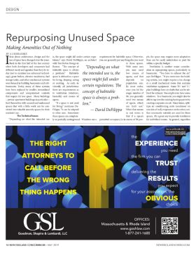DESIGN I deas about architecture, design and the is, the space might fall under certain regu- use of space have changed over the years. lations,” says David DeFilippo, an architect you can generally put anything else you want than can be easily undertaken or paid for Back in the first half of the last century with Tsoi Kobus Design in when both developers and consumers had Boston. “The concept of different needs and agendas than they do to- day (not to mention less advanced technol- ogy), giant boilers, elevator machinery, fuel space is defined as a space storage tanks, and other mechanical systems for living, sleeping, eating were housed in building basements and sub- basements. Today, many of these systems virtually all jurisdictions have been replaced by smaller, streamlined there are requirements as components and computerized controls to ventilation (windows, that require far less space. Many buildings basically) and means of – prewar apartment buildings in particular – egress. find themselves with unused and underused spaces that with a little work can be con- verted into valuable amenity spaces for their Filippo, “it can be adapted residents’ use. The Technical Issues “Depending on what the intended use ly or partially underground. Windows are a permitted occupancy is in excess of 50 peo- habitable space is always a problem.” Habitable or cooking. As such, in “If a space is not used for living,” continues De- to other uses. Sometimes these spaces are complete- requirement for habitable space. Otherwise, ple, the space may require more adaptation in these spaces. within a specific budget. With some uses you may need ation in repurposing spaces, particularly in two means of basements. “You have to exhaust the air,” egress, and that says DeFilippo. “If you move into the build- depends on population size. or a small mechanical room that contains By most codes, ventilation equipment. Some ‘H-’ and ‘U-’ once you hit the plan buildings have air shafts that can be uti- magic number of lized for exhaust. You might even have some 50, you generally windows. In a basement, you might also be need two means able to tap into the existing heating system by of egress, which creating a separate circuit. Many times, split- can limit use.” type air conditioning units (condenser on What that means one side of wall, evaporator on the other, nei- in real terms is ther necessarily outside) are used for these that if a space’s spaces. It’s a great way to provide ventilation Ventilation is another major consider- ing system, you might require a fan change for individual rooms. In general, regardless Repurposing Unused Space Making Amenities Out of Nothing BY A J SIDRANSKY 14 NEW ENGLAND CONDOMINIUM — MAY 2019 NEWENGLANDCONDO.COM the EXPERIENCE you need the firm you can TRUST delivering the RESULTS you expect for your association, the OBVIOUS choice Goodman, Shapiro & Lombardi, LLC OFFICES: Massachusetts & Rhode Island www.goshlaw.com 1-877-241-1600 THE RIGHT ATTORNEYS TO CALL BEFORE THE WRONG THING HAPPENS NE_Condominium_Horiz_HalfPg_4cv2.indd 1 1/15/2019 11:30:00 AM “Depending on what the intended use is, the space might fall under certain regulations. The concept of habitable space is always a prob- lem.” — David DeFilippo See us at Booth 121