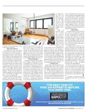 of whether there are windows, gyms always lobby level was converted to a gym. The require artificial ventilation.” What Are the Options? “It’s something I’ve done many times,” were able to work with an architect to add suggested a multi-use space that included dominium boards when she consults with says Susan Lauren, Principal of Lauren In- terior Design in New York City, about re- purposing existing spaces. “More and more that this type of repurposing requires De- older buildings are undertaking projects like partment of Buildings approval and a change rent out the space for high-end fundraising and perhaps most importantly for co-ops this to compete with new construction. One in the building’s Certificate of Occupancy. of the easiest things to do is to take an apart- ment or an unused space, usually in the base- ment, and turn it into an amenity. I did a ture in Chicago, describes the award-win- job at Renoir House \\\\\\\[on the Upper East Side ning adaptation of a courtyard in an apart- of Manhattan\\\\\\\], where they took an unused ment building constructed in the 1920s to a apartment and turned it into a gym. It was more modern use. “The building had an ‘H-’ occasional logjam that can result in missed nities mean added value, and added value so clever. It was simply a question of taking shape,” he says. “We took a portion of one of opportunity. “We worked with a condomin- down a couple of walls, and we retained the the courtyards and built bicycle storage. The ium building constructed in the 1960s,” he you sell – so if you’ve been eyeing a disused bathroom. We got rid of the kitchen and idea was to encourage residents to exercise, says. “At one time the building had a com- brought in appropriate flooring and equip- ment. The flooring was designed to cut to the lakefront and bicycle paths. Another it been out of operation for some 15 to 20 the time to turn it into something wonder- down on noise. It wasn’t difficult.” Lauren also describes another repurpos- ing where a space formerly used as the su- perintendent’s store room on the building’s we turned into a feature of the courtyard. It space was dark, but it was up against the the ground floor. It was a commercial space rused or unused space, Lauren suggests the exterior of the building, and as such they that went unused for a very long time. I following considerations to co-op and con- windows. Once the windows were installed, library shelves, seating, Wi-Fi, and a confer- light poured into the room. Lauren cautions ence table for shareholder meetings. We even can it accommodate? Is the space attractive Think Out of the Box Patrick Rosen, Partner at Rosen Architec- particularly due to the building’s proximity missary as part of the ground floor plan, but promising space in your building, it may be intention was to discourage driving. We years. It was just an empty space behind the ful. came up with a formula – one bike for ev- ery five units – and designed a shed, which a committee of residents set up by the condo has sliding barn- type doors and ter many meetings, the board pulled the plug lights that come on the project because of lack of consensus on automatically on what to do with the space. The space is when the doors still unused.” If you have an unused space, are open. This don’t make the mistake of letting a project amenity became to revitalize it get derailed by indecision or one of the main political infighting. That not only deprives features that the residents of an amenity, but it may mean that building adver- tises.” “People are becoming much more creative,” says Lauren of are gyms, community spaces, and storage. what she sees be- ing done in build- ings now. “At 535 and what your budget is. Storage, especially West End Avenue, in apartment buildings, is often a real neces- we did a multi-use sity – and it’s far less expensive and construc- space. They had a tion- and infrastructure-heavy than a gym or beautiful, round even a community space. corner space on installed a bar area with a refrigerator. They and inviting? Does it have windows? Finally, events. The room has two access points--one and condominiums, what amenities does through the lobby and the other from the your building currently have, and what do street--so if they rent it out for a party, no one competitive properties have? What ameni- is walking through the lobby to enter.” A Cautionary Tale Rosen recalls a situation that reflects the doorman’s desk. We were hired to work with board to re-purpose the space. In the end, af- your building or association will miss out on a potential revenue stream. What’s Popular According to both Rosen and Lauren, the most common and sought-after amenities The main considerations for choosing be- tween these uses are what space is available In deciding what to do with your unde- them: What is the size of the space? What ties would make – or keep – your building competitive with other buildings? In the case of condos and co-ops, ame- means more money in your pocket when basement corner, super’s apartment or other n A J Sidransky is a staff writer/reporter for New England Condominium, and a published novelist. NEWENGLANDCONDO.COM NEW ENGLAND CONDOMINIUM — MAY 2019 15 ISTOCKPHOTO.COM THE BEST TIME TO FIND AN EXPERT IS BEFORE YOU NEED ONE. SEAPORT WORLD TRADE CENTER, BOSTON — WEDNESDAY, MAY 22, 10-3:30 FREE REGISTRATION: NE-EXPO.COM THE NEW ENGLAND CONDOMINIUM EXPO 2019 WHERE BUILDINGS MEET SERVICES