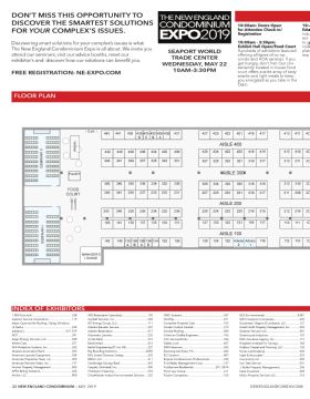 22 NEW ENGLAND CONDOMINIUM — MAY 2019 NEWENGLANDCONDO.COM SEAPORT WORLD TRADE CENTER WEDNESDAY, MAY 22 10AM–3:30PM DON’T MISS THIS OPPORTUNITY TO DISCOVER THE SMARTEST SOLUTIONS FOR YOUR COMPLEX’S ISSUES. Discovering smart solutions for your complex’s issues is what The New England Condominium Expo is all about. We invite you attend our seminars, visit our advice booths, meet our exhibitor’s and discover how our solutions can benefit you. FREE REGISTRATION: NE-EXPO.COM FLOOR PLAN INDEX OF EXHIBITORS 10:00am: Doors Open for Attendee Check-in/ Registration 10:00am - 3:30pm: Exhibit Hall Open/Food Court Hundreds of exhibitors featured offering all types of co-op, condo and HOA services. If you get hungry, don’t fret. Our con- veniently located in-house food court offers a wide array of tasty snacks and light meals to keep you energized as you take in the Expo. 10:4 Educ Indu ent i to gi insid plete expo 1-800-Got-Junk ......................................................238 Aalanco Service Corporation ...............................119 Adam Quenneville Roofing, Siding, Windows & Decks ..................................................................234 Addario’s ........................................................ 317, 319 ADT ..........................................................................241 Aegis Energy Services, LLC ..................................330 Aetna Corp. ............................................................221 AFA Protective Systems, Inc. .................................242 Alliance Association Bank .....................................232 American Laundry Equipment .............................334 American Properties Team, Inc. ...........................209 American Remote Video, Inc. ...............................137 Anchor Property Management ............................305 APEX-Billing Solutions ..........................................243 Arisfor, LLC ..............................................................400 ARS Restoration Specialists ..................................125 Asphalt Services, Inc. .............................................204 ATI Energy Group, LLC ..........................................111 Atlantic Elevator Service .......................................237 Atlantic Restoration ...............................................417 Automatic Laundry ................................................225 Avidia Bank ............................................................210 BankUnited .............................................................413 Becht Engineering BT, Inc.-NE .............................227 Big Blue Bug Solutions ......................................435D Billy Sweet Chimney Sweep .................................325 BRIGS, LLC ..............................................................311 Cambridge Savings Bank .....................................410 Carpets Unlimited, Inc. ..........................................430 Champion Cleaning ..............................................218 ChuteMaster Indoor Environmental Services ....322 CINC Systems .........................................................337 ClickPay ...................................................................411 Complete Property Care .......................................102 Condo Control Central .........................................219 Corolla Roofing ......................................................200 Criterium Dudka Engineers ..................................106 CSC ServiceWorks .................................................236 Dabbs Lock .............................................................427 DMA Reserves ........................................................342 Downing Van Dyke, P.C. ........................................442 ECI Systems ............................................................407 Empire Condominium Professionals ...................233 First Realty Management Corp. ...........................127 FirstService Residential ..............................201, 201A Flynn Law Group ....................................................211 Fowler Companies .................................................103 GES Environmental .............................................435C GNY Insurance Companies ..................................426 Goodman, Shapiro & Lombardi, LLC ..................121 Great North Property Management, Inc. ............203 Greener Horizon LLC .............................................301 Greenwood Industries ..........................................107 H&K Insurance Agency, Inc...................................112 Hingham Institute For Savings .............................143 Hudson Carpet and Flooring, LLC.......................123 Hynes Landscaping ...............................................332 Ingle & Associates .................................................323 Insurcomm, Inc. ......................................................309 Iron Tree Service ....................................................331 J. Butler Property Management ...........................206 Kane Insurance .......................................................335 Kelly’s Property Services LLC ................................116