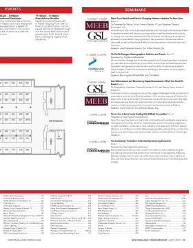 EVENTS 45am – 3:00pm: cational Seminars ustry professionals will pres- in-depth seminars designed ive attendees a wealth of der information. For a com- e list of seminars, visit ne- o.com Kidd-Luukko Corporation .....................................133 Knollmeyer Building Corp ....................................313 KONE Elevators and Escalators, Inc. ...................336 KTM Exteriors .........................................................231 LP Building Solutions ............................................217 Marcus, Errico, Emmer & Brooks, P.C. .................202 Marvin Windows and Doors .................................113 Matrix Fitness..........................................................142 Mercantile Property Management Corp., AAMC 341 Meridian Realty Group LLC ..................................321 Met Life Insurance .................................................134 Milltown Plumbing, Heating, Air Conditioning and Drain Cleaning .....................................................223 Moriarty Troyer & Malloy LLC ...............................304 Mutual of Omaha Bank .........................................327 N&L Contracting Solutions, Inc. ...........................230 NEWENGLANDCONDO.COM NEW ENGLAND CONDOMINIUM — MAY 2019 23 EVENTS SEMINARS 45am – 3:00pm: cational Seminars ustry professionals will pres- in-depth seminars designed ive attendees a wealth of der information. For a com- e list of seminars, visit ne- o.com 11:00am – 3:30pm: Free Advice Booths Experienced professionals in fi elds ranging from law to fi nance to association mainte- nance will be on-hand through- out the show with advice and answers for both board mem- bers, managing agents and residents. 10:45AM-11:45AM 11:45AM–12:45PM 1:45PM–2:30PM 2:30PM–3:30PM Short-Term Rentals and Electric Charging Stations—Updates On New Laws Room 1 Co-Presented by: Marcus, Errico, Emmer & Brooks, PC, and Goodman, Shapiro & Lombardi, LLC Come fi nd out how recently adopted state law and municipal ordinances applicable to short-term rentals will impact your association, as well as what boards must do to comply with new laws passed by the City of Boston mandating that owners be allowed to install electric charging stations. Key provisions of these laws will be discussed, as well as how they will affect condo associations in both the short and long term. Speakers: Janet Oulousian Aronson, Esq. & Ellen Shapiro, Esq. Ch-Ch-Ch-Changes—Demographics, Policies, and Trends Room 2 Sponsored by: FirstService Residential All communities change over time; demographics shift, board members come and go, new state and local policies go into effect, and the fi nancial landscape evolves. Successful, well-governed communities have the ability to address and adapt to these changes. Come fi nd out how your building or association can best position itself to do just that. Speakers: Bryan Hughes, Michael Refat, and Chris Malloy Lien Enforcement and Recovering Unpaid Assesments—What You Need To Know Room 1 Co-Presented by: Goodman, Shapiro & Lombardi, LLC, and Marcus, Errico, Emmer & Brooks PC Delinquent common charges are one of the biggest challenges facing condominium associations, and can be diffi cult to address. In this seminar, experts will discuss the latest trend in lien enforcement; the superlien law and foreclosures. Learn the steps and measures your board can take to protect your association and improve the recovery of delinquent payments. A question-and-answer period will follow. Speakers: Henry Goodman, Esq. & Richard Brooks, Esq. There’s One In Every Family—Dealing With Diffi cult Personalities Room 2 Presented by: New England Condominium Even the most harmonious, tight-knit community will eventually experience interpersonal confl ict, whether it be between board members, neighbors, or staff members. Come learn how industry pros deal with ‘diffi cult’ person- alities in a multifamily context while staying positive, productive, and profes- sional, and what resources exist to help resolve confl ict without resorting to litigation. You Community’s Foundation—Understanding Governing Documents Room 1 Presented by: New England Condominium Many people purchase a condo or townhome without really understanding the foundational documents that govern their community. Come learn the difference between a bylaw and a house rule, which documents residents have a right to ac- cess, and how documents can—and should—be amended as communities grow and change. Kidd-Luukko Corporation .....................................133 Knollmeyer Building Corp ....................................313 KONE Elevators and Escalators, Inc. ...................336 KTM Exteriors .........................................................231 LP Building Solutions ............................................217 Marcus, Errico, Emmer & Brooks, P.C. .................202 Marvin Windows and Doors .................................113 Matrix Fitness..........................................................142 Mercantile Property Management Corp., AAMC 341 Meridian Realty Group LLC ..................................321 Met Life Insurance .................................................134 Milltown Plumbing, Heating, Air Conditioning and Drain Cleaning .....................................................223 Moriarty Troyer & Malloy LLC ...............................304 Mutual of Omaha Bank .........................................327 N&L Contracting Solutions, Inc. ...........................230 National Cooperative Bank ..................................339 National Grid ..........................................................105 NFC Amenity Management ..................................333 No Risk Painting .....................................................208 NOREL Service Company, Inc ..............................435 North Point Property Management LLC ..............316 NorthStar Insurance Services, Inc. .....................
