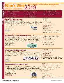 26 NEW ENGLAND CONDOMINIUM —MAY 2019 NEWENGLANDCONDO.COM American Properties Team, Inc. American Properties Team, Inc., is a full-service company specializing in community association management. The fi rm’s 40 plus year track record proves it is large enough to offer in-depth service, yet small enough to provide personal attention. Management services include: accounting, strong fi scal accountability, proactive maintenance, short and long term planning, leadership, facilitation, medi- ation, and community building. Community websites and online management service are included in all management packages. As an active participant in CAI, American Properties Team is on the cutting edge of the community association management industry. 500 West Cummings Park, Suite 6050 Woburn, MA 01801 phone 781-932-9229 • fax 781-935-4289 info@APTCondoTeam.com www.APTCondoTeam.com OUR COMPANY 4 DESIGNATIONS/AFFILIATIONS CMCA, AMS, PCAM, ARM, CPM, CAI, CPA 4 KEY PEOPLE Jeff Ewing, President, Carol Dempsey, Senior Vice President, Jennifer Pappas, Rocco LaCivita, Ed Goodwin, Elias Silva, Todd Symonds 4 DIRECT CENTRAL OFFICE EMPLOYEES over 10 4 ASSOCIATIONS MANAGED 30 4 UNITS MANAGED 3,500 4 GEOGRAPHIC CLIENT CONCENTRATION Eastern Massachusetts and Cape Cod 4 PERFORM CAPITAL RESERVE STUDIES Yes 4 VALUE-ADDED TECHNOLOGIES Web-based services, association websites included in all management contracts MANAGEMENT DESIGNATION KEY 2019 M anageMent irectory Who’s Who in New England Condominium Management Affi nity Realty & Property Management, LLC Affi nity Realty & Property Management, LLC, located in Boston, is a CAI member fi rm, handling 50 associations inside the Route 495 belt. Principals include Rick Bendetson and Stephen DiNocco, ARM. Affi nity offers proven management systems with a low unit-to- personnel ratio, multifaceted real estate experience, fl exibility, and a reliable and consistent approach to community issues. Affi nity actively manages, markets, develops, and/or fi nances real estate ventures. Our unique experiences help property owners realize consis- tently higher values. Local offi ces are located in North Andover. 63 Atlantic Avenue, Boston, MA 02110 857-239-8280 x670; 800-388-6468 FAX: 857-239-8289 E-mail: Stephen@affi nityrealty.com OUR COMPANY 4 DESIGNATIONS/AFFILIATIONS CMCA, AMS, CAI, IREM, ARM 4 KEY PEOPLE Stephen DiNocco, CMCA, AMS 4 DIRECT CENTRAL OFFICE EMPLOYEES over 5 4 ASSOCIATIONS MANAGED 50 4 GEOGRAPHIC CLIENT CONCENTRATION Eastern Massachusetts 4 PERFORM CAPITAL RESERVE STUDIES No ActionVest Management ActionVest Management believes that a condominium is not only a home but also an investment. ActionVest has developed an exten- sive management program, including property management, maintenance and cleaning services. We implement cost saving measures and provide for short and long term goals. We believe that our property management philosophy and program coupled with our dedicated, knowledgeable staff will provide your condominium with the reliable, responsive and professional property management services you deserve. As you search for a property management fi rm, please consider ActionVest Management Corp. 1667 Commonwealth Avenue Brighton, MA 02135 617-783-8888 . Fax 617-783-8880 eric.mason@actionvest.com www.actionvest.com OUR COMPANY 4 DESIGNATIONS/AFFILIATIONS ARM, IREM, CAI, GBREB 4 KEY PEOPLE Eric Mason and Oisin McCarthy 4 DIRECT CENTRAL OFFICE EMPLOYEES over 9 4 ASSOCIATIONS MANAGED 60+ 4 UNITS MANAGED 2,100+ 4 GEOGRAPHIC CLIENT CONCENTRATION Greater Boston Area 4 VALUE-ADDED TECHNOLOGIES Full-service accounting and project administration, property manage- ment, maintenance & cleaning. 4 STRENGTHS Building value for our condominium associations. MANAGEMENT CORP. AV_Envelope10_9.indd 1 10/10/07 10:20:12 am 2019 AAMC Accredited Association Management Company AMO Accredited Management Organization AMS Association Management Specialist ARM Accredited Residential Manager BOMA Building Owners and Managers Association CAI Community Associations Institute CFM Certifi ed Facility Manager CMCA Certifi ed Manager of Community Associations CPM Certifi ed Property Manager CPO Certifi ed Pool Operator GBREB Greater Boston Real Estate Board IREM Institute of Real Estate Management LCS Licensed Construction Supervisor RPA Real Property Administrator NAHP National Affordable Housing Professional NAIOP National Association of Industrial & Offi ce Properties PCAM Professional Community Association Manager NNA National Notary Association NSPF National Swimming Pool Foundation Allied Property Management Allied Property Management established June 11, 2004 specializes in the management of condominium associations across Eastern Massachusetts. Striving to be more than just a management company, we build business and personal relationships with our clients. Working with each client, we establish customized service plans to meet and exceed their expectations, which have resulted in positive changes in our clients communities. Services include site inspection, contractor procurement, capital planning, budget planning, vendor relations and coordination and fi nancial management. P.O. Box 315 North Billerica, MA 01862 800-436-7348 Fax: 978-452-7718 Info@APManages.com www.APManages.com OUR COMPANY 4 DESIGNATIONS/AFFILIATIONS CAI, IREM, NAPW 4 KEY PRINCIPALS Christine Burke 4 DIRECT CENTRAL OFFICE EMPLOYEES 4 4 ASSOCIATIONS MANAGED 15 4 UNITS MANAGED 360 4 GEOGRAPHIC CLIENT CONCENTRATION Massachusetts 4 STRENGTHS Experience in both small and large associations, strong emphasis on customer service, attention to detail. Our turn around time and communi- cations with our clients is top notch.