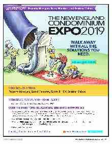 NEWENGLANDCONDO.COM NEW ENGLAND CONDOMINIUM — MAY 2019 37 OVER 175 EXHIBITORS! EDUCATIONAL SEMINARS! NETWORKING! • Save time and build relationships – Meet with over 175 exhibitors offering endless solutions in every area including building management, insurance, security, landscaping, maintenance, energy, telecommunications, plumbing, HVAC, fuel, interior design, and more. • Learn from the experts – Attend educational seminars. • Receive FREE expert advice – Visit our FREE Advice Booths and get valuable guidance from our legal, financial, management and building experts. • Win great door prizes. WHO SHOULD ATTEND Property Managers, Board Members, Condo & HOA Decision Makers Free Registration: ne-expo.com WEDNESDAY, MAY 22, 2019 • 10AM - 3:30PM S EAPORT W ORLD T RADE C ENTER , B OSTON , MA One Day. One Location. Endless Solutions. ATTENTION Property Managers, Board Members, and Decision Makers ne-expo.com WALK AWAY WITH ALL THE SOLUTIONS YOU NEED. THE NEW ENGLAND CONDOMINIUM EXPO 2019