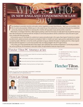 2019 LEGAL PROFIL Flynn Law Group has attorneys with over 100 years of combined experience. Our condominium practice has grown immensely due primarily to referrals from our existing clients. We believe this is a direct result of our quick response, quality legal work, and successful results. Flynn Law Group represents many property associations throughout Massachusetts. The firm has ad- ditional expertise in commercial leasing and commercial landlord-tenant matters, including evictions. In addition, the firm has a longstanding practice of representing landlords in regard to residential landlord and tenant matters, including evictions. Many times, these other areas of expertise have been required in our representation of and advice to condominium associations. The firm specializes in advice to the condominium trust, collection of outstanding condominium fees, amendments to the condominium documents, and lawsuits regarding disruptive tenants or unit owners. OUR COMPANY 4 PRINCIPALS Frank A. Flynn, Esq., Managing Partner 4 ATTORNEYS IN CONDO LAW 9 4 YEARS OF EXPERIENCE IN CONDO LAW 100+ 4 ASSOCIATIONS SERVED 100+ 4 STATES ADMITTED TO BAR MA, RI, NH, CT, ME, VT 4 PERCENTAGE OF BUSINESS CONDO LAW 50% 4 PERCENTAGE OF REVENUE FROM CONDO LAW 50% 4 DO YOU TAKE CASES ON CONTINGENCY NO 4 PREPARED DOCUMENTS FOR NEWLY FORMING CONDOS NO 4 ATTORNEYS IN FIRM TRY CASES IN COURT YES 185 Devonshire St., Suite 401, Boston, MA 02110 p: 617-988-0633 | f: 617-988-0637 | Contact: Frank A. Flynn, Esq. Frank@FlynnLaw-NE.com, KaLing@FlynnLaw-NE.com, www.FlynnLaw-NE.com Flynn Law Group Frank A. Flynn Esq. F rom developer-to-association transition and vendor contract negotiation to owner-board disputes, legal issues are inevitable in the life of a community association. Whether you’re in the market for your first condominium, or serving on the board of an established community, relying on the advice of an attorney who is familiar with association issues and documents is essential. While there’s no shortage of law firms in New England, plucking a name from the results of a web search may not yield the results you want. Not all attorneys are conversant with the intricacies of community associations—and the condominium issues that seem to grow more complex with every passing day. As the premier source of information for condominium owners and professionals in this region, New England Condominium receives countless emails, website comments and queries via Facebook, Twitter or LinkedIn each week. Legal questions easily lead the list of top- ics raised by readers. With that in mind, this month’s publication brings you detailed information on leading law firms in New England that have extensive experience in community association law, and neatly packaged in the 2019 Legal Directory. In this listing, you’ll find essential data about these lawyers—who collectively have centuries of experience in community association law, and can guide you, the homeowner or association leader, through whatever issues you may encounter. 14 NEW ENGLAND CONDOMINIUM -JUNE 2019 NEWENGLANDCONDO.COM Fletcher Tilton PC Attorneys at law OUR FIRM 4 CONDOMINIUM SPECIALIST Nelson L. Santos, Esq. 4 ASSOCIATIONS SERVED 16 4 STATES ADMITTED TO BAR MA 4 PREPARED DOCUMENTS FOR NEWLY FORMING CONDOS YES 4 ATTORNEYS IN FIRM TRY CASES IN COURT YES 370 Main Street, 12th Floor, Worcester, MA 01608 | T: 508-459-8000 • F: 508-459-8300 E-mail: nsantos@fletchertilton.com • www.fletchertilton.com With our unmatched perspective, Fletcher Tilton has thrived for nearly 200 years by achieving successful outcomes for our clients. n Counsel to trustees, board members, and property managers n Assistance with condominium documents, policies & bylaws, liens & common expenses n Representation in financing, transactional, and litigation matters Nelson Luz Santos, Esq. 508-532-3525