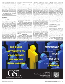 NEWENGLANDCONDO.COM NEW ENGLAND CONDOMINIUM -JUNE 2019 19 the EXPERIENCE you need the firm you can TRUST delivering the RESULTS you expect for your association, the OBVIOUS choice Goodman, Shapiro & Lombardi, LLC OFFICES: Massachusetts & Rhode Island www.goshlaw.com 1-877-241-1600 THE RIGHT ATTORNEYS TO CALL BEFORE THE WRONG THING HAPPENS NE_Condominium_Horiz_HalfPg_4cv2.indd 1 1/15/2019 11:30:00 AM tablish the right to enforce it going for- ward. And should a law change, it could render a documentary provision unen- forceable, or even a violation of the law. One example would be the Fair Hous- ing Law regarding familial status, which would make rules restricting use of a pool to adults-only during certain hours ‘per se’ violations of federal law.” “Some inconsistencies between the law and the documents are simple and non-controversial, like sending meeting notices, conducting elections, budget- ing and other procedural issues,” adds Magill. “Other times, the members may not understand that the board is required to follow the law rather than the docu- BOARD... continued from page 10 or does so solely to line his or her own pockets, deviating from community gov- erning documents is always a bad idea. Those particular rules are laid out for good reason, and following them in good faith is a solid strategy for avoiding most serious trouble. When it comes to asso- ciation governance, the cool kids are the ones who dutifully follow all of the rules. n Mike Odenthal is a staff writer/reporter with New England Condominium ments, which could cause ire among the members. “For example,” she continues, “the as- sociation cannot enforce restrictions striction to cite when I prepare to send always try and appeal to the conscience against children residing in the commu- nity unless that community qualifies as “Obviously you cannot enforce a rule that board members and the managing agents Housing for Older Persons. The associa- tion must allow owners to install an up- to-one-meter receiver, even though most the level of rules, but are frowned upon says Shmulewitz. “If it feels wrong, or you governing documents prohibit outdoor or will draw backlash if violated. Failing would be embarrassed if the matter came antennae. The board may have to allow to wear decent attire, using foul language out in the media, just say no.” That may someone to maintain an emotional sup- port or service dog on the property, even bad’ behavior in common areas is prob- if the documents prohibit pets or ani- mals.” Katz-Leavy describes the debate over units is disgusting, but not typically ad- which rules should take precedence as a dressed in rules until it happens. Formal we’re all in this together! “legal hierarchy.” “Federal law trumps state law, state law an enforcement process, such as levying trumps declarations, declarations trump fines or pursuing arbitration, unless the bylaws, bylaws trump rules, etc.,” he says. conduct is so outrageous – and persistent “I would advise a board not to enforce – that it is considered a nuisance.” a provision of a condo document that clearly contradicts federal or state statute. footing when the enforcement action In Maine, we often see condo documents deals with a violation of a written regula- that have become outdated and are not tion,” admits Katz-Leavy. “Sometimes you consistent with the Maine Condominium can hang your hat on a more general rule, Act and/or the Maine Nonprofit Corpora- tions Act.” Blurred Lines Confusion can arise when a board for regulating conduct that occurs within member or manager is perceived to be en- gaging in behavior that is objectively not more limited when it comes to regulating in violation of anything in the law or the activities taking place within an individ- documents, but just seems, well...wrong. “I can’t tell you how many times a board or manager will call to report a fail to indict particularly egregious be- violation and I cannot find a rule or re- a demand for compliance,” says Magill. of the transgressor. “The best guide for doesn’t exist. However, there are mores who work with them is common sense in each community that may not rise to and an innate sense of right and wrong,” or derogatory slurs, and other simply-put sound overly optimistic, but it’s always lematic. Allowing your dog to urinate on teer to run their community associations the balcony so that it drips down on other to have a functional moral compass and a rule-making may be necessary to initiate “The association is on its most solid such as ‘a unit-owner cannot do anything that constitutes a nuisance.’ In general, the association has fairly broad latitude its common elements, but they’re much ual unit.” When the governing documents do havior, a board member or resident can important for the individuals who volun- respect for their fiduciary duty. After all, n Mike Odenthal is a staff writer/reporter with New England Condominium. the unit,” says Toscano. “We won’t nec- essarily fix the broken pipe, but we will turn off the water immediately, and dry out the unit to prevent mold. We don’t make repairs without the owner’s permis- sion. We preserve the unit so the damage doesn’t get worse. That’s a legal obliga- tion.” “There’s enough liability to go around,” says Halper. “Management has the au- ABSENT OWNERS continued from page 12 continued on page 20