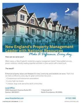 2 NEW ENGLAND CONDOMINIUM -JULY 2019 NEWENGLANDCONDO.COM www.fsresidential.com 617.221.1000 Local Office 3000 Davenport Avenue Suite 201 Canton, MA 02021 1 Overlook Cir North Providence, RI 02904 New England’s Property Management Leader with National Resources Make A Difference. Every day. How can we serve you? What makes us New England’s residential property management leader? Value-added services, proven solutions, industry-leading expertise and best-in-class service with a local touch. The result? Enhanced property values and lifestyles for every community and residents we serve. That’s how we make a difference, every day, for great communities like yours… • Condominium and homeowners associations • Luxury high-rise towers • Lifestyle, large scale and active adult communities