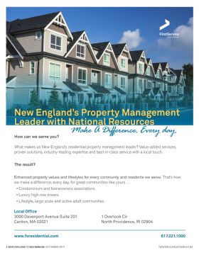www.fsresidential.com 617.221.1000 Local Office 3000 Davenport Avenue Suite 201 Canton, MA 02021 1 Overlook Cir North Providence, RI 02904 New England’s Property Management Leader with National Resources Make A Difference. Every day. How can we serve you? What makes us New England’s residential property management leader? Value-added services, proven solutions, industry-leading expertise and best-in-class service with a local touch. The result? Enhanced property values and lifestyles for every community and residents we serve. That’s how we make a difference, every day, for great communities like yours… • Condominium and homeowners associations • Luxury high-rise towers • Lifestyle, large scale and active adult communities 2 NEW ENGLAND CONDOMINIUM -SEPTEMBER 2019 NEWENGLANDCONDO.COM