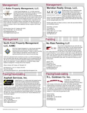 NEWENGLANDCONDO.COM NEW ENGLAND CONDOMINIUM -NOVEMBER 2019 17 Management Management J. Butler Property Management, LLC. J. Butler Property Management, LLC. is a family owned and managed Massachusetts based property management company. We are able to provide our client associations with an unparalleled level of condominium service by consistently deliver- ing open communication with the board, superior vendor and cost management solutions, meticulous financial budgeting and access to our own in-house maintenance and groundskeeping crews. Our company structure, comprehensive man- agement style and core principles relating to responsibility and work ethic represent a unique combination of benefits for our client associations. At J. Butler Management, we measure our success in terms of client satisfaction and take a long-term view of every relationship. 2500 Main Street, Suite 105, Tewksbury MA 01876 Phone: 978-694-9004 • Fax: 978-694-9008 www.jbutlerpropertymgmt.com Clientsvc@jbutlerpropertymgmt.com Management Management North Point Property Management LLC, AAMC North Point Property Management is a client-focused organization serving the needs of condominium associations throughout Massachusetts and New Hampshire. To obtain our goal of providing a higher standard of management, North Point relies on its experienced staff and the use of state-of-the-art technology. North Point understands that the investments we make in our staff and technology are two of the primary factors that set us apart and allow us to form a partnership that truly “fits” with your community. North Point is dedicated to building long-term relationships based on one simple goal, “To make a difference for our clients by setting a higher standard of management.” Servicing MA and New Hampshire. Offices in Andover, MA* Nashua, NH* Meredith, NH* 300 Brickstone Sq., Ste. 201, Andover, MA 01810 Phone 877-423-5050 www.northpointmanagement.com • gmackenzie@northpointmanagement.com Paving/Sealcoating Paving/Sealcoating Asphalt Services, Inc. Asphalt Services, Inc. is a family-owned and operated business that has been providing commercial and residential paving services for over 30 years. We have grown into the region’s most versatile and successful full service paving and site work operation. We take a tremendous amount of pride in our work, our clients, and our employees. Our goal is to provide prompt quality workmanship, and create an aesthetically-pleasing result that will last for years to come. We provide all types of asphalt paving to apartment complexes, condo associations, shopping centers, office parks and more. Give us a call today and find out why Asphalt Services, Inc. was ranked in the nation’s top contractors for 2014, 2015 and 2016 by the “ Pavement Maintenance and Reconstruction magazine. ” Asphalt Services, Inc. 210 New Boston St. Woburn, MA 01801 Phone: 781-938-6800 Website: www.PaveWithAsi.com Email: info@pavewithasi.com Management Management Meridian Realty Group, LLC. Meridian Realty Group is a Boston/Worcester- based real estate company specializing in property management. We pride ourselves on the person-to-person relationship with each building we represent whether it be on a full service 24/7 property management basis or administrative, billing and back office services. As the two company executive principals (Keith Shirley and Valerie Post) we have managed property since 1979. Meridian prides itself on its ability to provide our clients with personalized attention and cost-effective solutions. Keith Shirley, Co-founder 46 Gloucester St. Boston, MA 02115 617-517-0854 Fax 617-517-0849 keith@mrgproperty.com www.mrgproperty.com No Risk Painting LLC Are you tired of using painters for your condo who over charge and under perform? No Risk Painting has painted hundreds of condos and thousands of homes over the past decade. No Risk Painting will warranty your paint job in writing longer than any other painter in New England, all while guaranteeing to have the best price. You can continue to use the same company with the same results, or you can choose to go with the company with an A+ rating with BBB and have a 100% satisfaction guarantee. We service all MA and southern NH. We can service all of your association’s paint needs. We would love to discuss your next painting project. James R. Clark 295 Reservoir St. Needham, MA 02494 617-904-9299 • Fax 781-400-2363 jamie@noriskpainting.com www.noriskpainting.com Painting R.L. Goldman Co. Inc. For decades, R.L. Goldman Co. has satisfied the paving requirements of community associations. Services offered by the company include paving, seal coating, crack sealing, asphalt repairs, complete parking lot reconstruction, striping and concrete repairs. The company is also experienced in tennis and recreation court construction and re-surfacing. R.L. Goldman Co. has a growing list of satisfied clients and has handled the most demanding asphalt projects all over New England and New York State. R.L. Goldman Co. is fully insured and guarantees its work. Richard Goldman Westborough, MA 508-898-9293 • fax 508-366-6266 www.rlgoldman.com RLGPAVE@aol.com Paving/Sealcoating