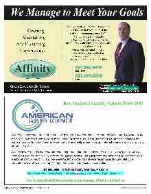 2 NEW ENGLAND CONDOMINIUM -NOVEMBER 2019 NEWENGLANDCONDO.COM We are pleased to announce that we have joined our two companies, Automatic Coin Laundry Systems and American Equipment Sales Corporation. Leasing, rentals, and sales, as well as our service and parts de- partments, now function under one company. This greatly streamlines our internal operations, allowing us to better serve you. We are New England’s longest operating independent laundry services provider. As always, our goal is to install and operate high quality community laundry rooms. Our equipment provides the best combination of energy efficiency, reliability, and pay systems technology. Our service response is fast and effective. We thank you and value the opportunity to be your laundry services provider. New England’s Laundry Experts Since 1945 781.894.6600 | 1345 Main Street, Waltham, MA 02451 sales@americanlaundryequipment.com | www.americanlaundryequipment.com For a complimentary laundry room survey, please contact us